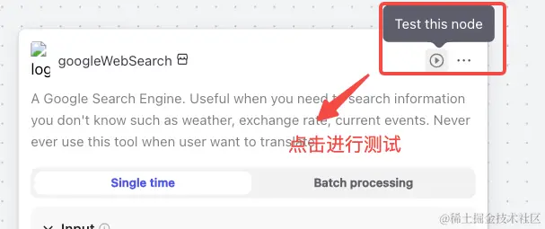 我先通过测试谷歌搜索节点的能力拿到谷歌搜索节点的输出,也就是 Code 节点的输入