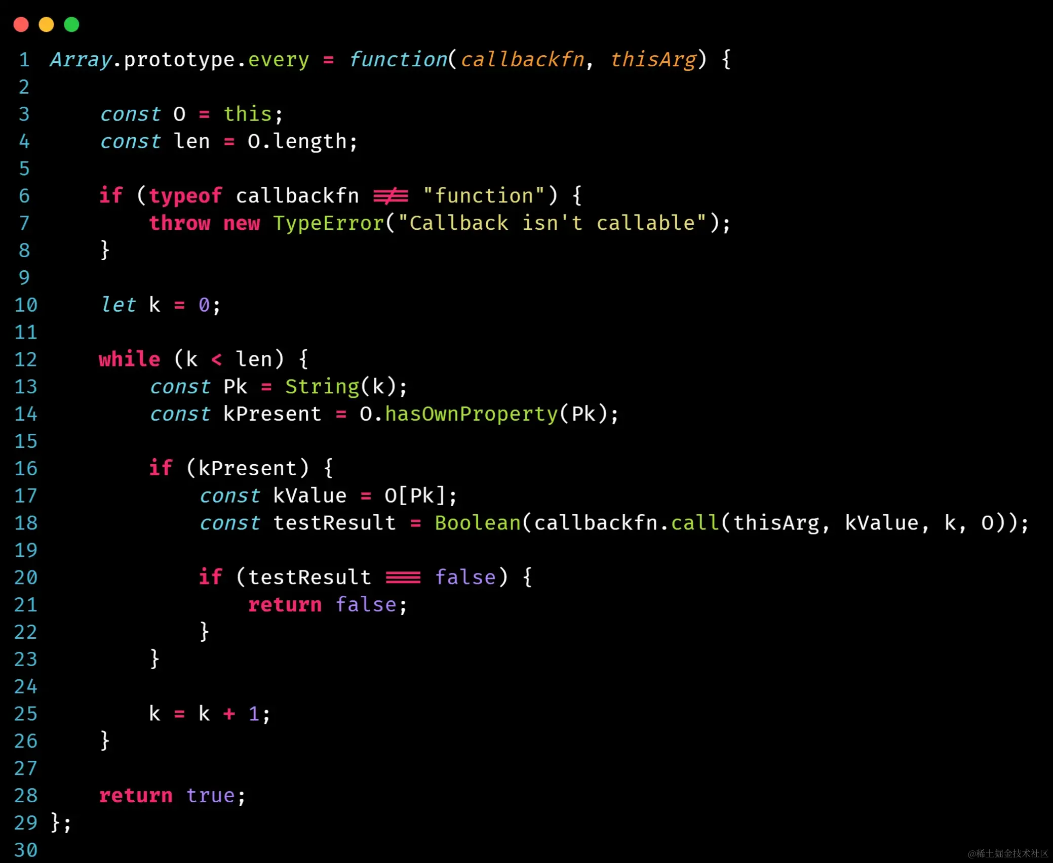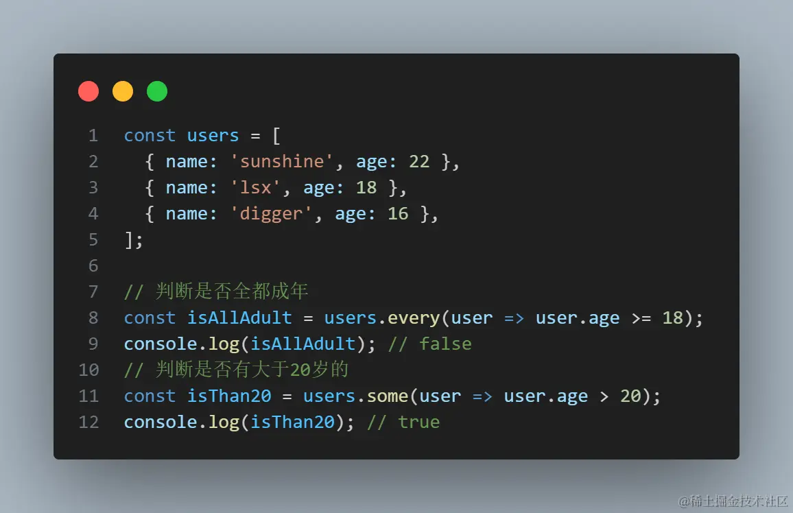但是我觉得我不应该那么理解,我应该理解为:every 判断数组是否至少有一个不符合条件,这么去理解的话,自然就能知道为什么空数组是返回 true了,因为就没有不符合条件的,当然就是返回 true 啦~