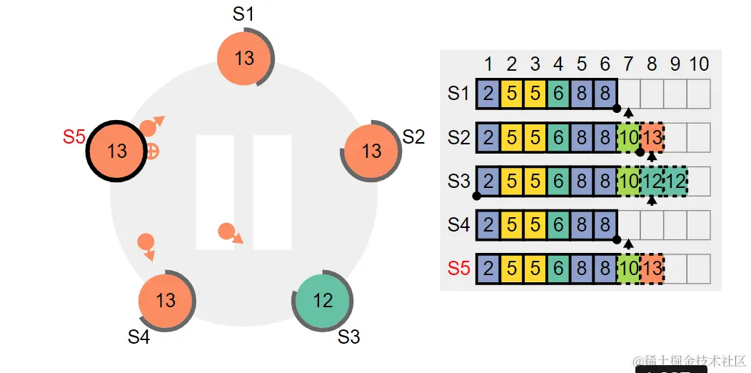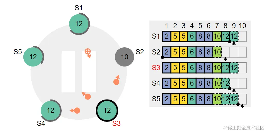 下面图片的12,S3就是朱允炆的皇叔朱棣,成功篡位(因为有两个节点仍处于8的时代,加上自己总共3个,占了多数)