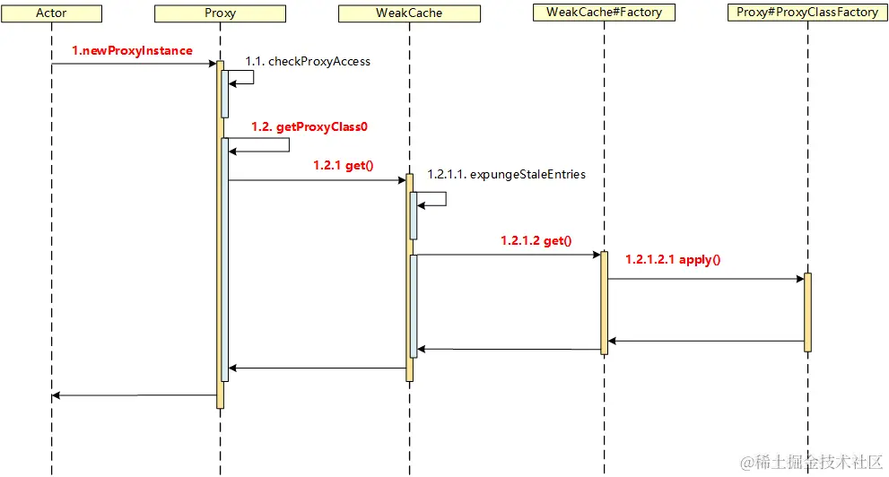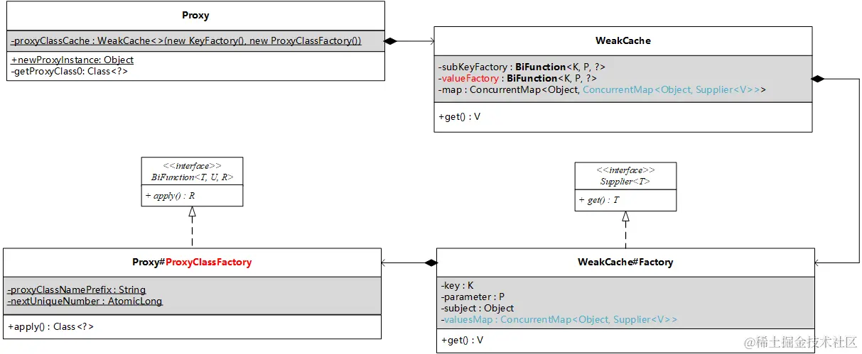 - WeakCache.valueFactory 的具体实现是 Proxy#ProxyClassFactory,该实例是在 Proxy 初始化 proxyClassCache 属性时作为参数传入的