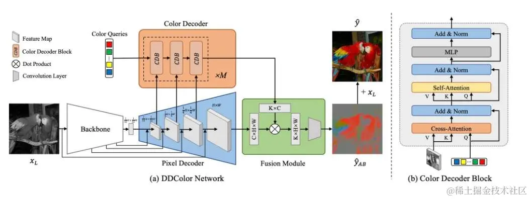 DDColor 是最新的 SOTA 图像上色算法,能够对输入的黑白图像生成自然生动的彩色结果。算法整体流程如下图,使用 UNet 结构的骨干网络和图像解码器分别实现图像特征提取和特征图上采样,并利用 Transformer 结构的颜色解码器完成基于视觉语义的颜色查询,最终聚合输出彩色通道预测结果。