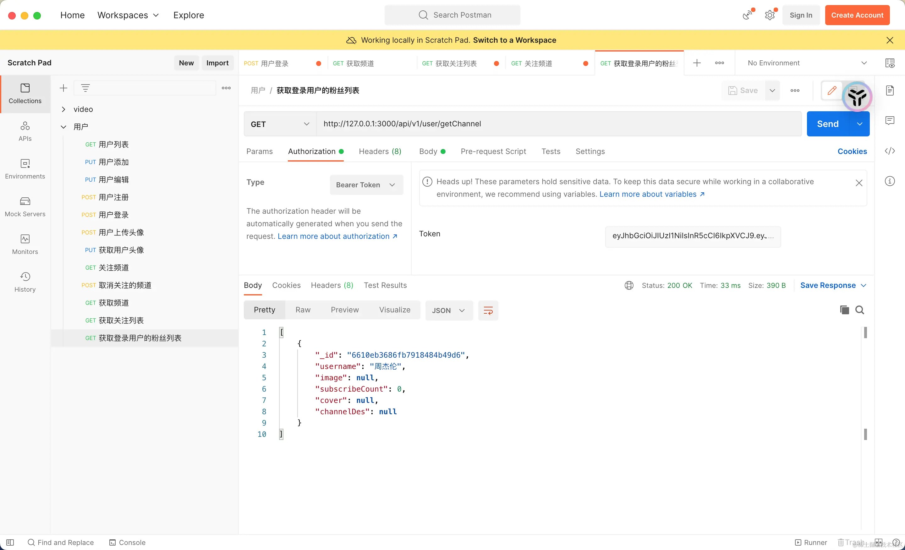 同样,使用Postman来验证粉丝列表接口的正确性。