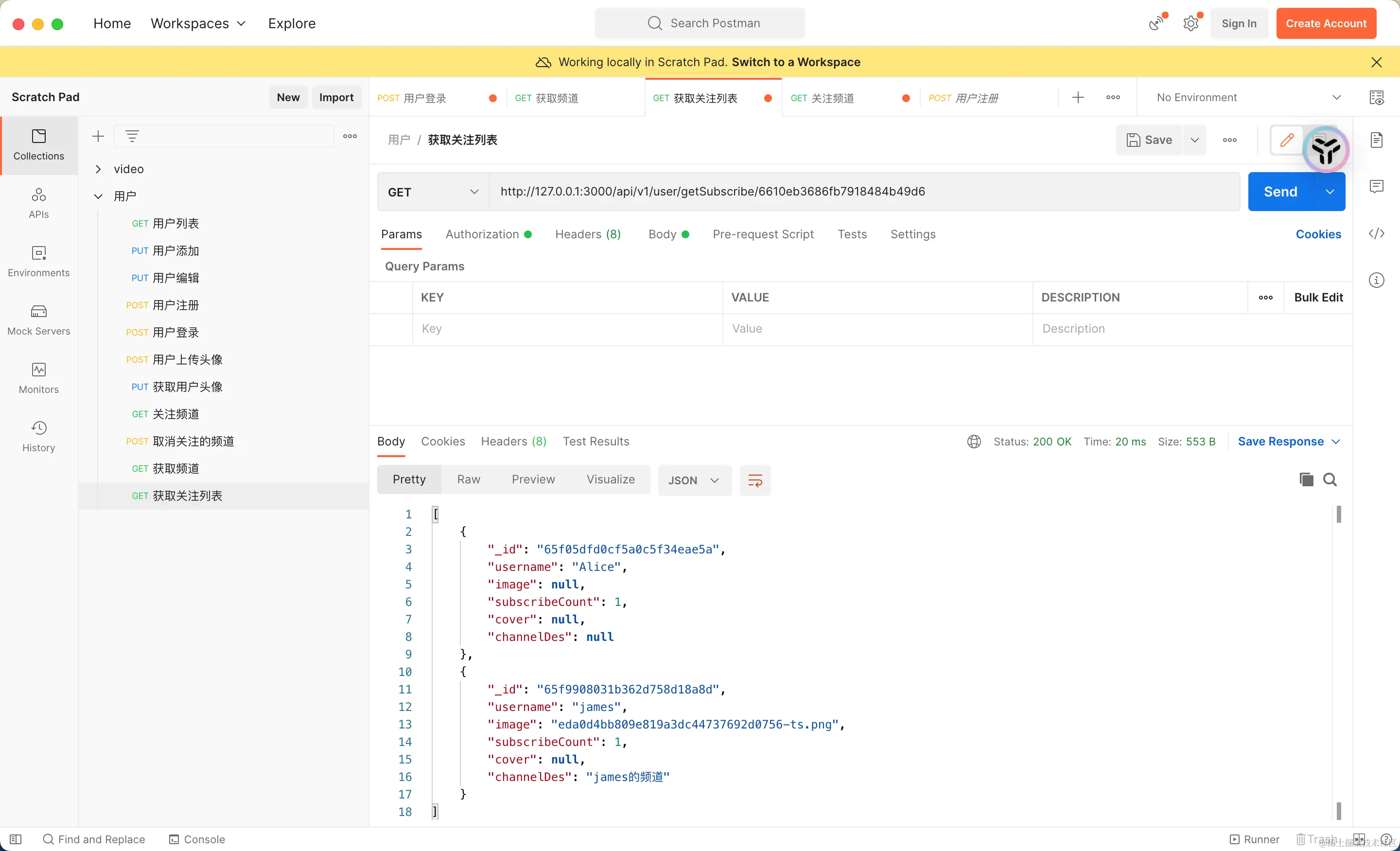 这里的/getSubscribe/:userId路由将接受一个用户ID作为参数,用来查找这个用户关注的所有人。