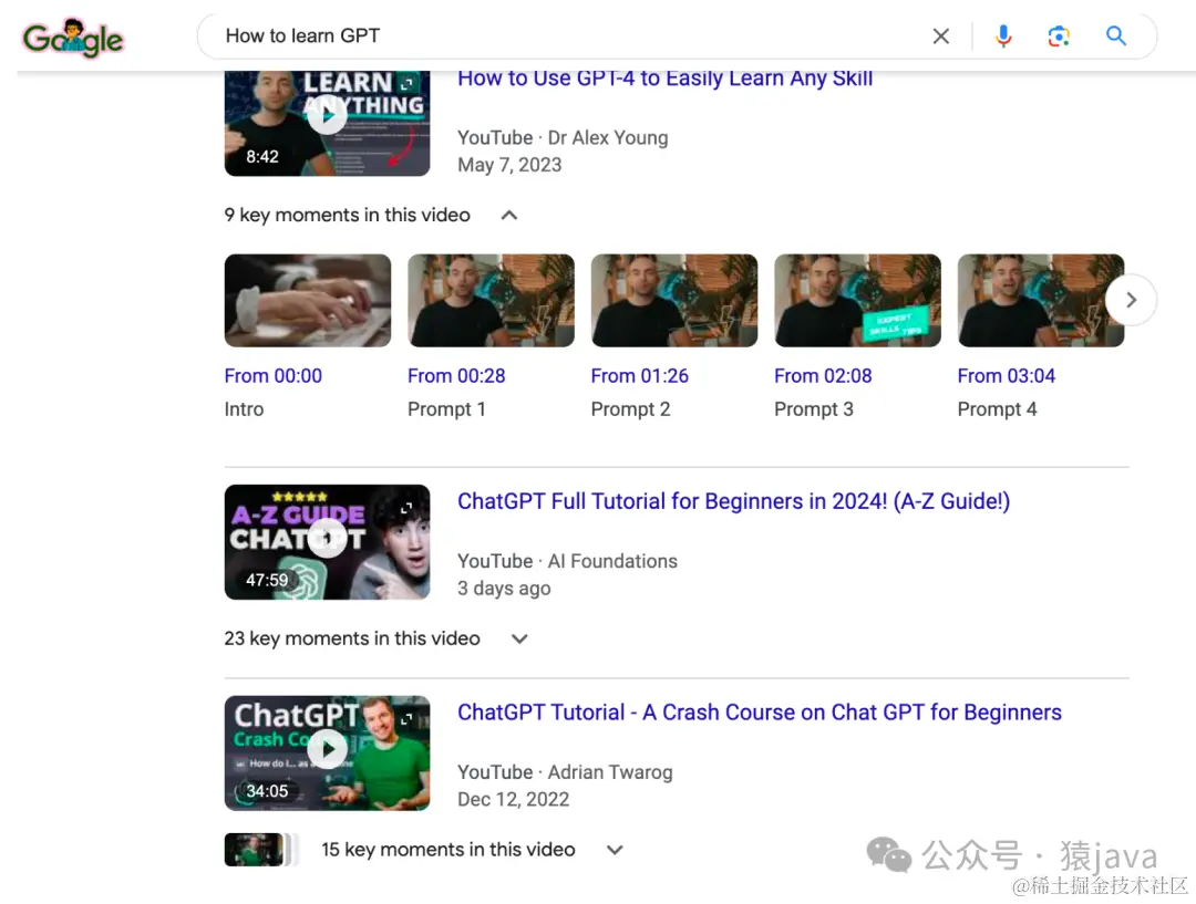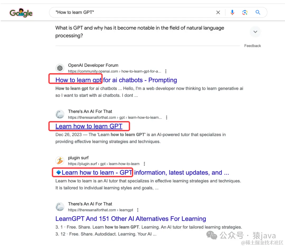 如果将关键词用引号包裹,Google就会进行深度搜索,搜索结果会包含引号内所有的关键词,比如,我们通过关键词 How to learn GPT 来对比下带引号和不带引号的区别: