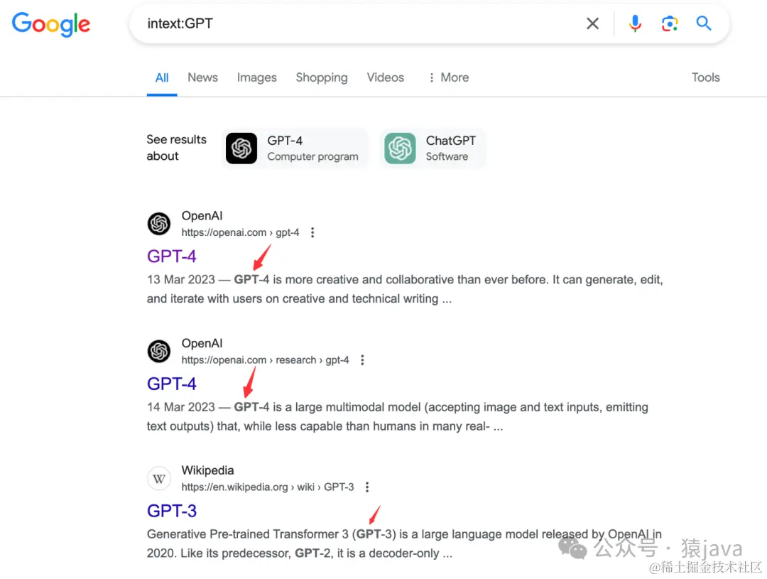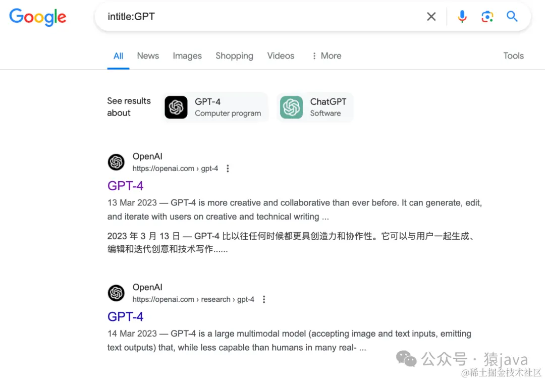 intex: 和 intitle: 可以组合使用,如下图,搜索标题和内容都包含 GPT的内容: