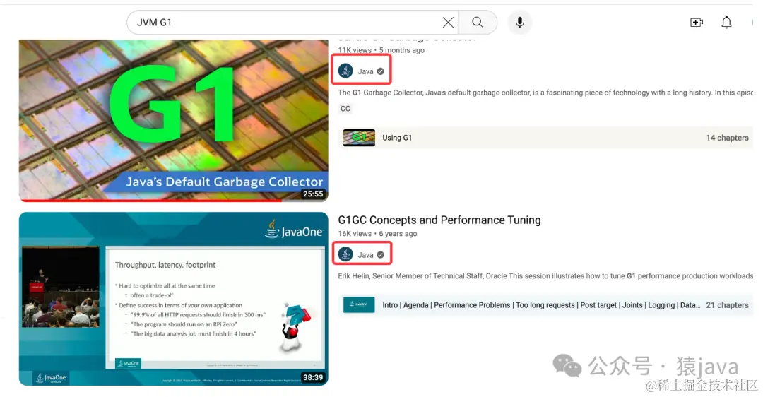这里以 Youtube为例,如下图,如果想学习 JVM 中G1垃圾回收器,可以输入关键词:JVM G1,搜索结果的前几条视频都是 Java官方频道发布的,原汁原味。