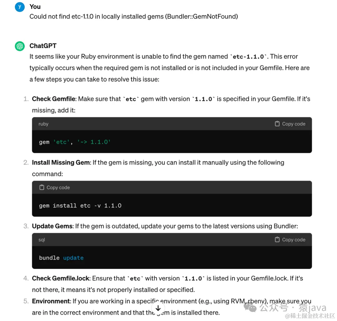 这里以 ChatGPT 为例,如下图是在本地启动环境遇到的一个错误,因此,直接将错误信息放到 ChatGPT上搜索,ChatGPT会直接给出答案,按照答案很快就解决了问题。