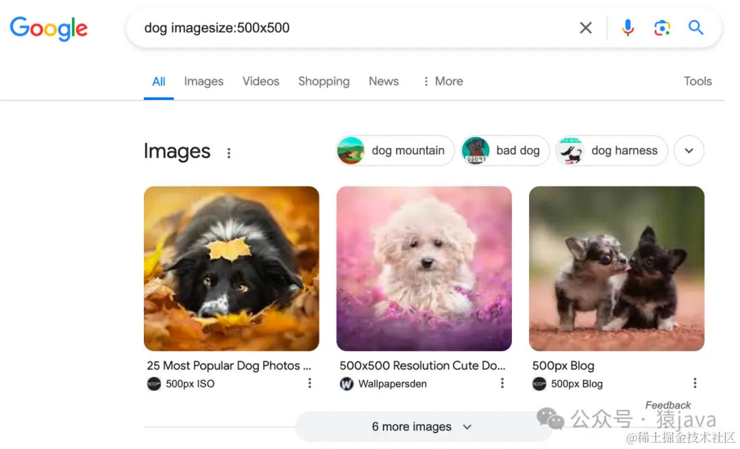如果想搜索指定宽和高的图片,可以在搜索查询中使用 imagesize:标签。如下图,搜索 500 * 500 的狗的图片。