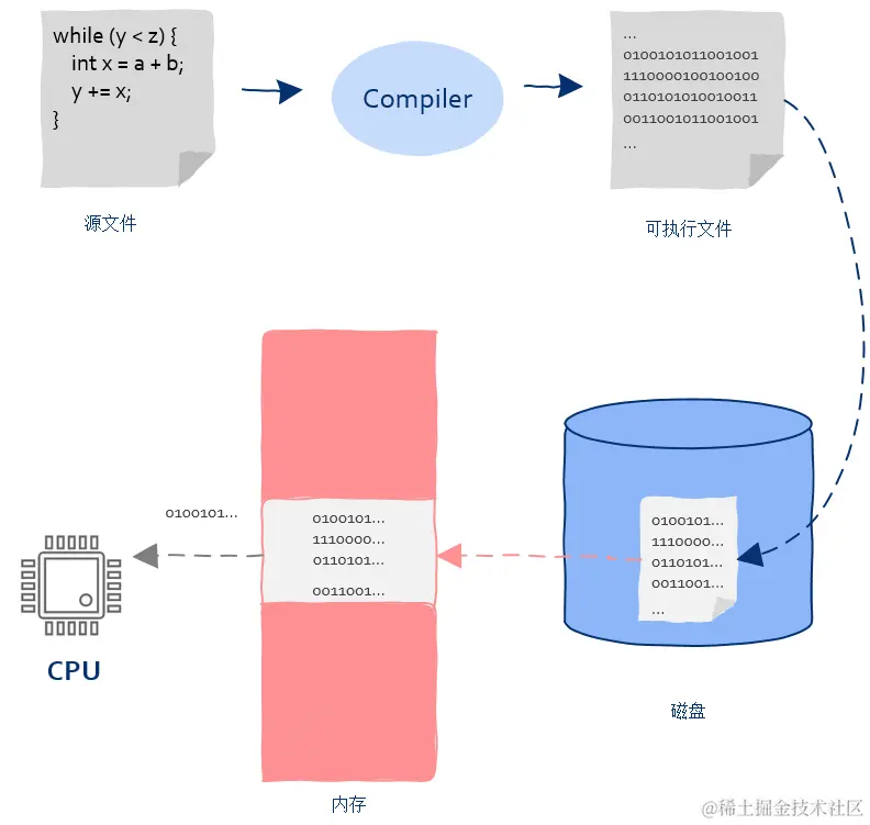 那么是谁来设置PC寄存器中的指令地址呢? 原来PC寄存器中的地址默认是自动加1的,这当然是有道理的,因为大部分情况下CPU都是一条接一条顺序执行,当遇到if、else时,这种顺序执行就被打破了,CPU在执行这类指令时会根据计算结果来动态改变PC寄存器中的值,这样CPU就可以正确的跳转到需要执行的指令了。聪明的你一定会问,那么PC中的初始值是怎么被设置的呢?在回答这个问题之前我们需要知道CPU执行的指令来自哪里?是来自内存,废话,内存中的指令是从磁盘中保存的可执行程序加载过来的,磁盘中可执行程序是编译器生成的,编译器又是从哪里生成的 机器指令呢?答案就是我们定义的函数/方法。