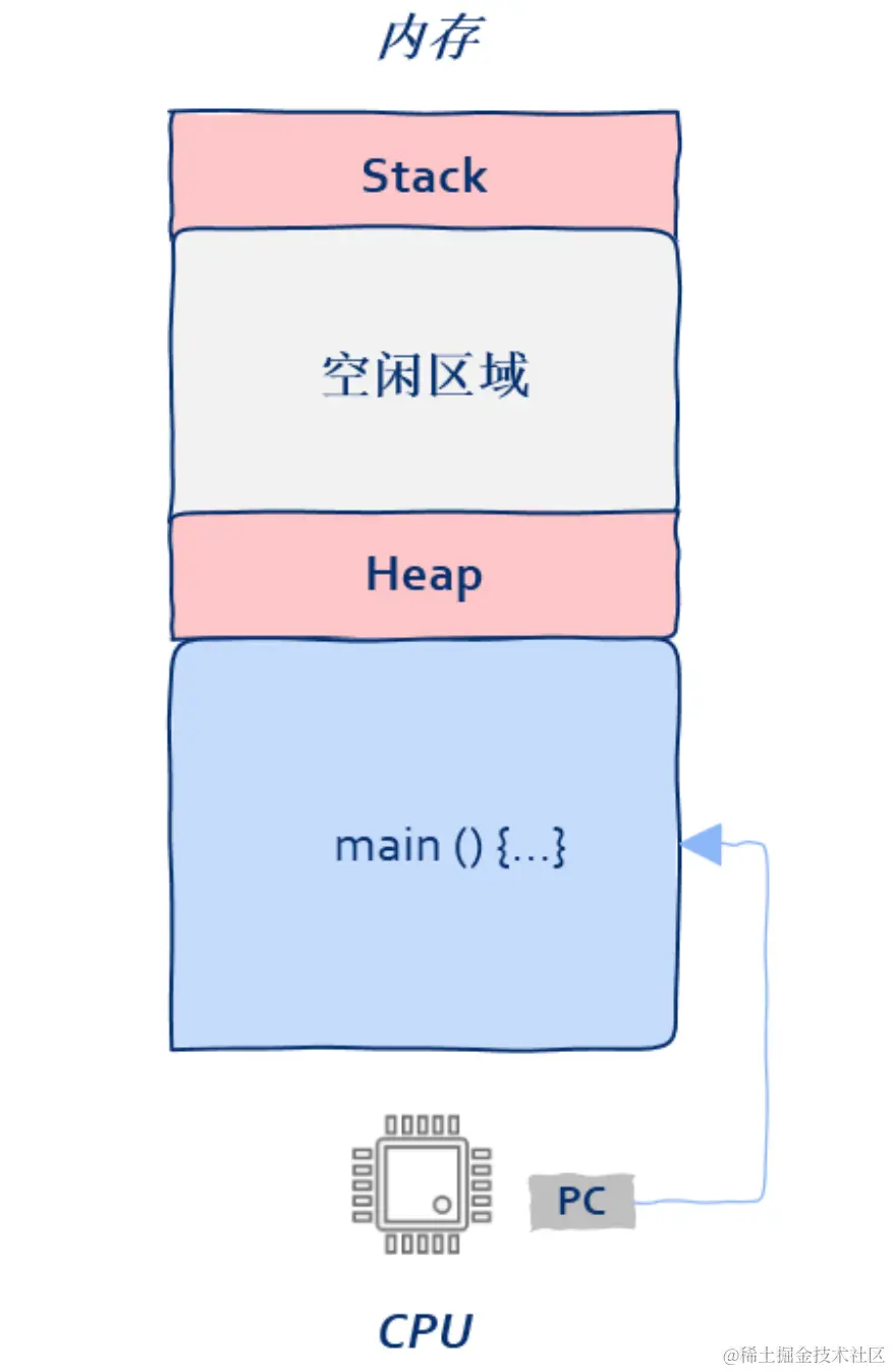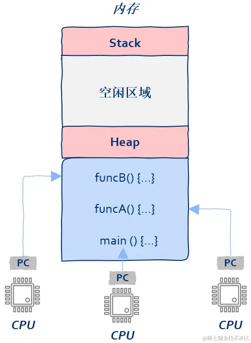 你看,如上图所示,在这里CPU确实是不知道什么进程、线程之类的。接下来的问题就是 CPU 从哪里取出指令呢?答案是来自一个被称为Program Counter(简称 PC )的寄存器,也就是我们熟知的程序计数器,在这里大家不要把寄存器想的太神秘,你可以简单的把寄存器理解为内存,只不过存取速度更快而已。PC寄存器中存放的是什么呢?这里存放的是指令在内存中的地址,什么指令呢?是CPU将要执行的下一条指令。