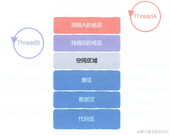 我们知道了线程和 CPU 的关系,也就是把 CPU 的 PC 寄存器指向线程的入口函数,这样线程就可以运行起来了,这就是为什么我们创建线程时必须指定一个入口函数的原因。那么线程和内存又有什么关联呢?我们知道函数在被执行的时产生的数据包括函数参数、局部变量、返回地址等信息,这些信息是保存