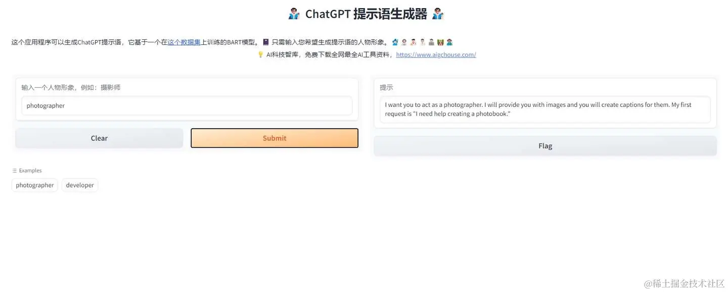 3:浏览器操作在浏览器中访问 http://127.0.0.1:7860/,即可通过浏览器界面使用ChatGPT-Prompt工具。