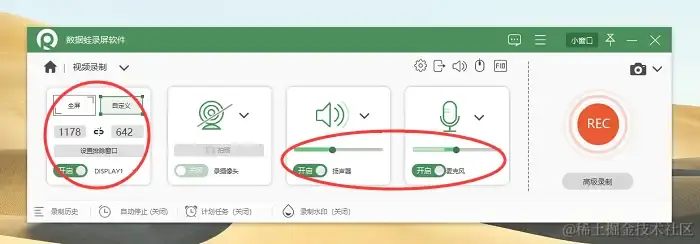 步骤2:在视频录制界面,设置录制的区域。可以选择全屏录制或自定义区域录制,还可以调整扬声器与麦克风的音量大小。