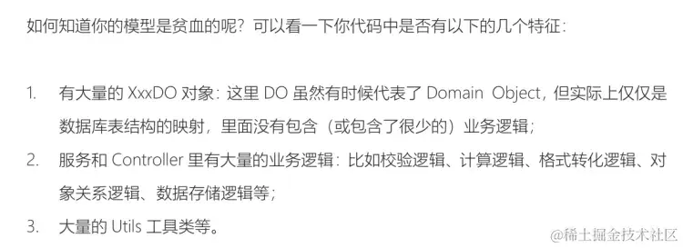 贫血模型具有一堆属性和set get方法,存在的问题就是通过 pojo 这个对象上看不出业务有哪些逻辑,一个 pojo 可能被多个模块调用,只能去上层各种各样的service 来调用,这样以后当梳理这个实体有什么业务,只能一层一层去搜 service,也就是贫血失忆症,不够面向对象。