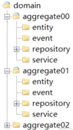 Domain 是由一个或多个聚合包构成,共同实现领域模型的核心业务逻辑。聚合内的代码模型是标准和统一的,包括:entity、event、repository 和 service 四个子目录。