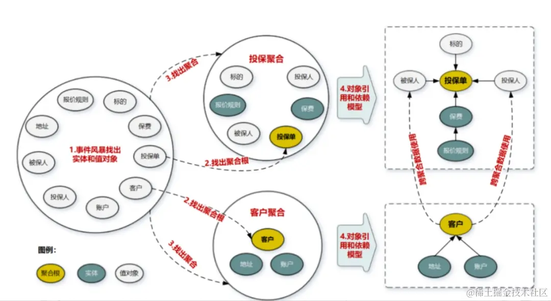 - 进一步分析每个上下文内部,识别出哪些是实体,哪些是值对象。