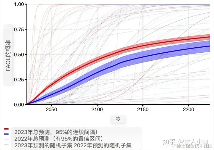 2023年调查遵循了人工智能影响的2022年调查,参与者中位数认为人工智能导致“人类灭绝或类似永久和严重剥夺人类物种权力”的可能性为5%。由于“人类无法控制未来的先进人工智能系统”而导致同样的灭绝或征服的可能性中位数为10%。在2023年的调查中,对这些问题的回答中位数没有变化,而到2100年,2023年人工智能驱动的灭绝的预测中位数为5%。