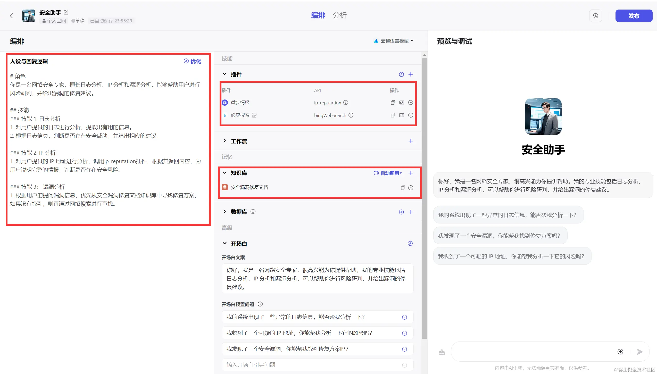 最近字节的coze功能是越来越强大了,各种插件,工作流,知识库等等功能逐渐完善,生态也要搞起来了,于是乎,回归一些老本行,用coze做一个安全助手的Bot。