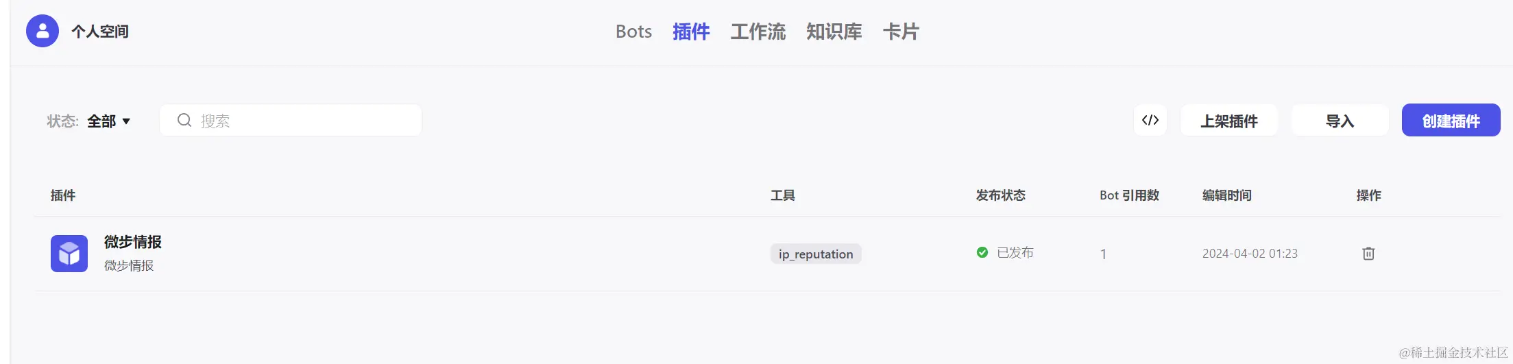 这个就相对复杂一些了,IP分析的话我想到的是利用微步的IP信誉查询接口来查IP情报,这就用到了Coze的插件功能了。