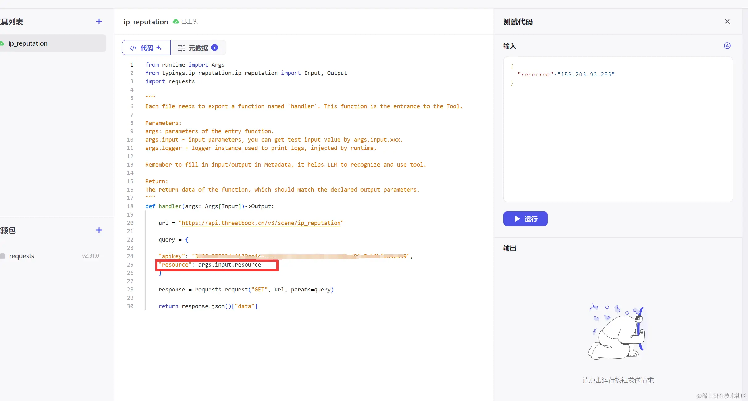 每个微步账号每天有50次的IP信誉查询次数,根据微步提供的官方api信息,在coze插件用以IDE的方式进行插件开发