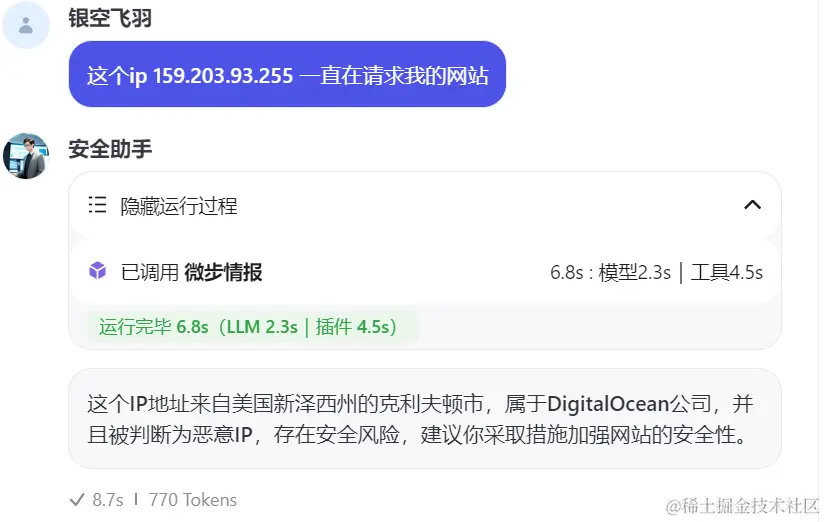 1. 对用户提供的 IP 地址进行分析,调用ip_reputation插件,根据其返回内容,为用户说明完整的情报,判断是否存在安全风险。