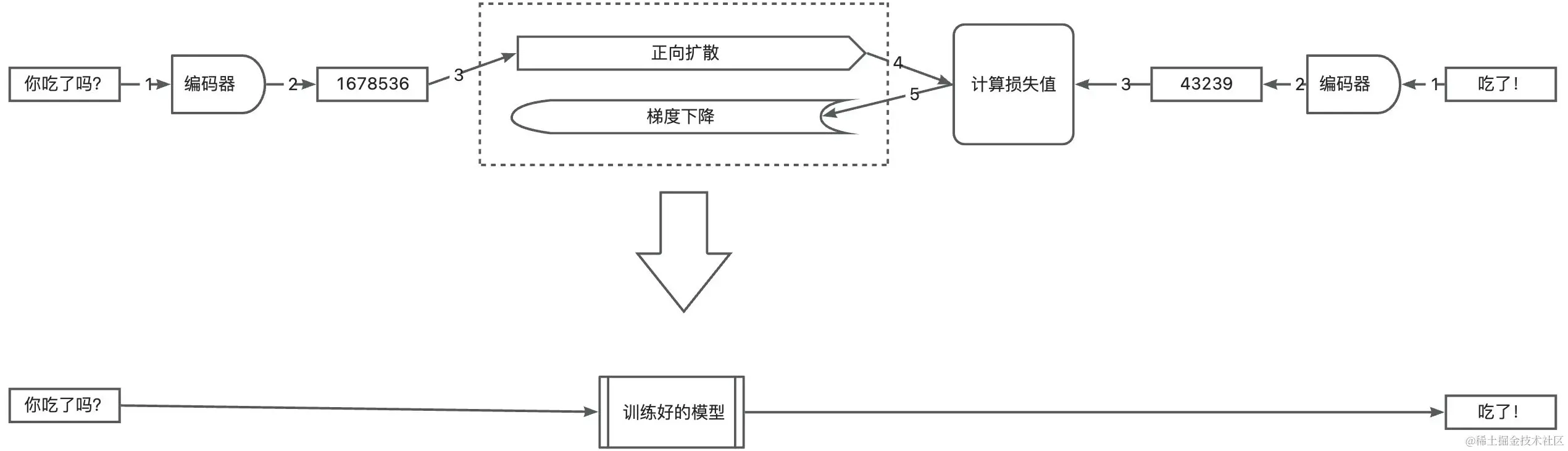 上面演示的是一个最简单的对话训练过程,在这个过程中,首先要把输入(你吃了吗?)与输出(吃了!)编码成数学模型能直接计算的数据,之后,经过深度学习梯度下降的过程,完成模型训练。
