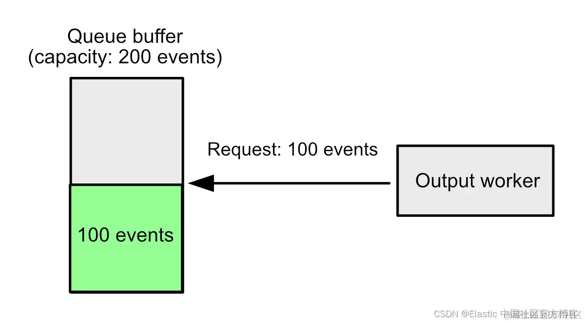 当输出 worker 准备好发送数据时,它会从内部队列请求一批事件。这个请求的大小由 bulk_max_size 控制,这是一个重要的输出调优参数。如果 bulk_max_size 是 100,那么队列将尝试提供 100 个事件给输出 worker 发送。