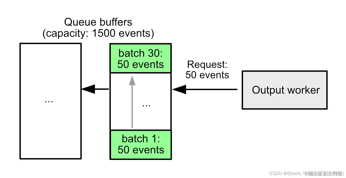 队列还有一个 flush.timeout 参数。当这个参数为零时,队列会立即返回事件,即使它没有足够的事件。在我们的示例中,如果请求了 100 个事件但队列中只有 50 个,那么输出 worker 将获得 50 个事件。但是当 flush timeout 为正值时,队列会等待达到指定的超时时间以收集更多事件。