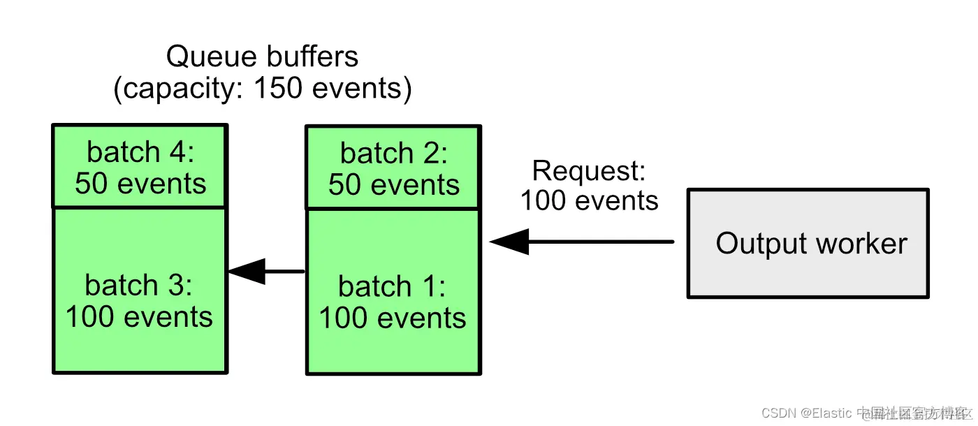 我们有一个队列,里面有 300 个事件,输出每次请求 100 个事件。理论上,我们应该能够将 300 个事件作为三批每批 100 个事件发送,但队列的缓冲区大小为 150 个事件,队列一次只从一个缓冲区返回事件。因此,实际上发生的是每个缓冲区被分成两批 —— 一批 100 个事件和一批 50 个事件。