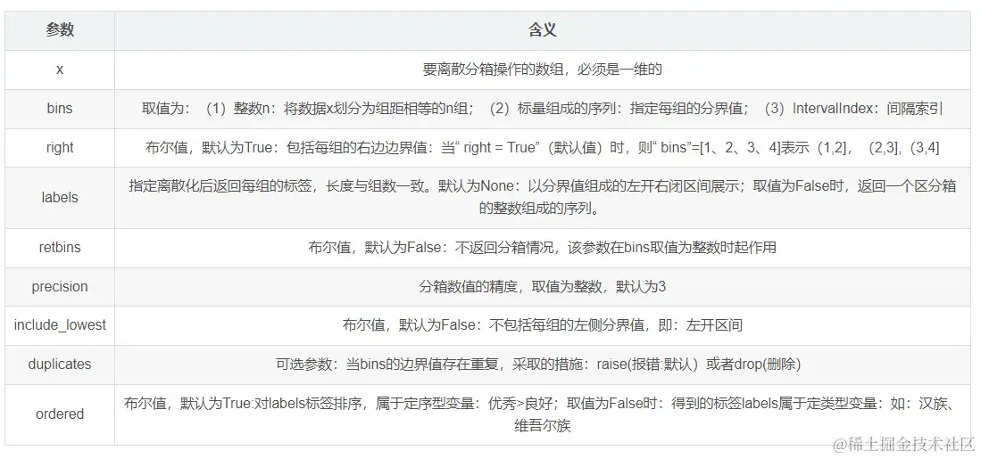 重点说下 bins :整数,标量序列或者间隔索引,是进行分组的依据,