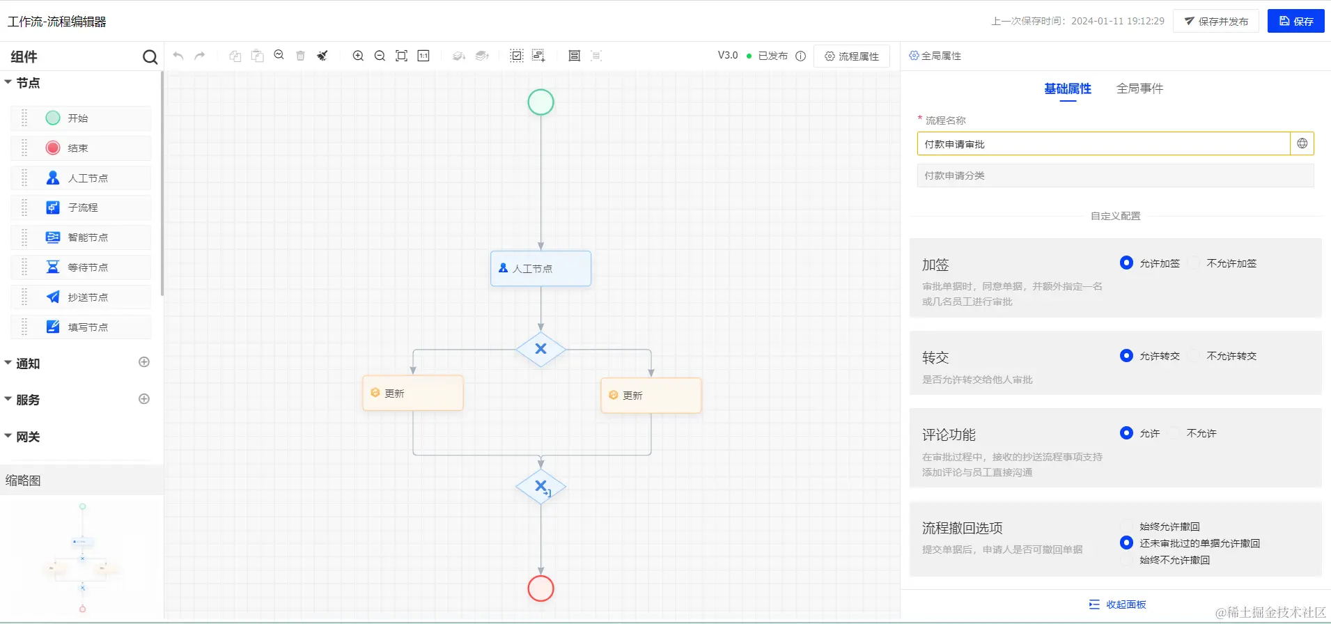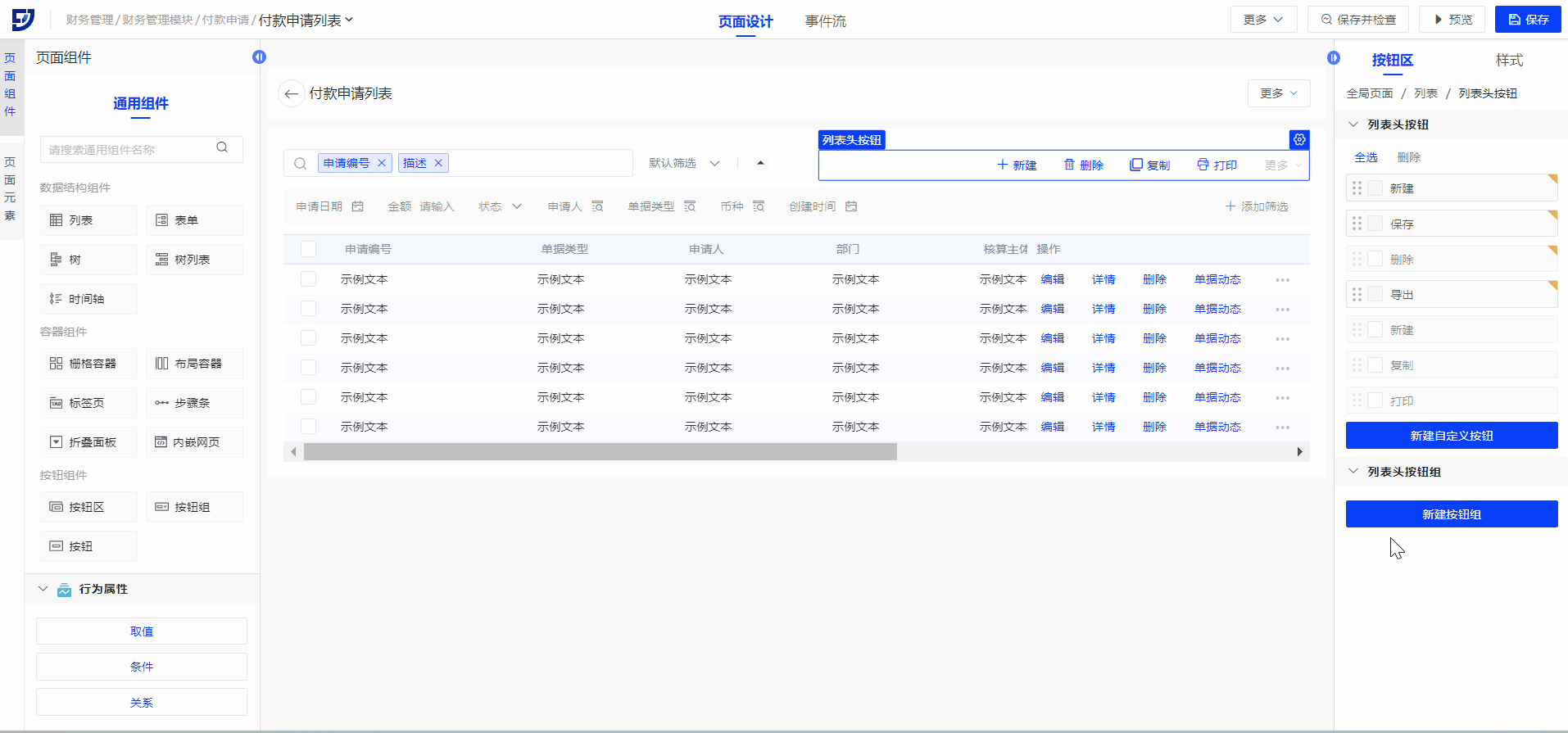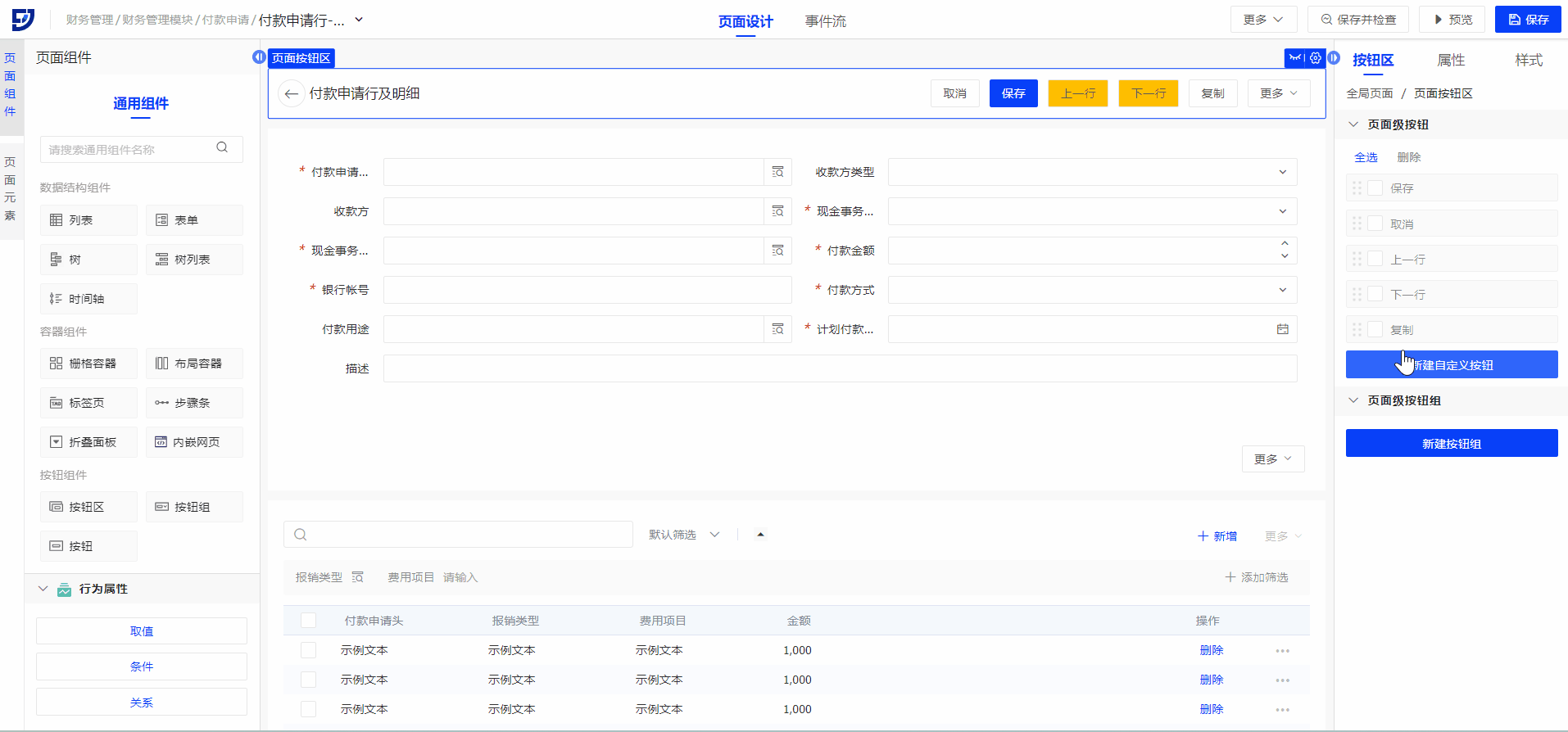 在财务系统中,完成页面基本搭建后,对于付款申请功能而言,用户创建单据后通常需要管理员进行审批。通过飞搭事件流中的发起工作流节点,结合流程平台的功能,可以轻松实现这一场景。