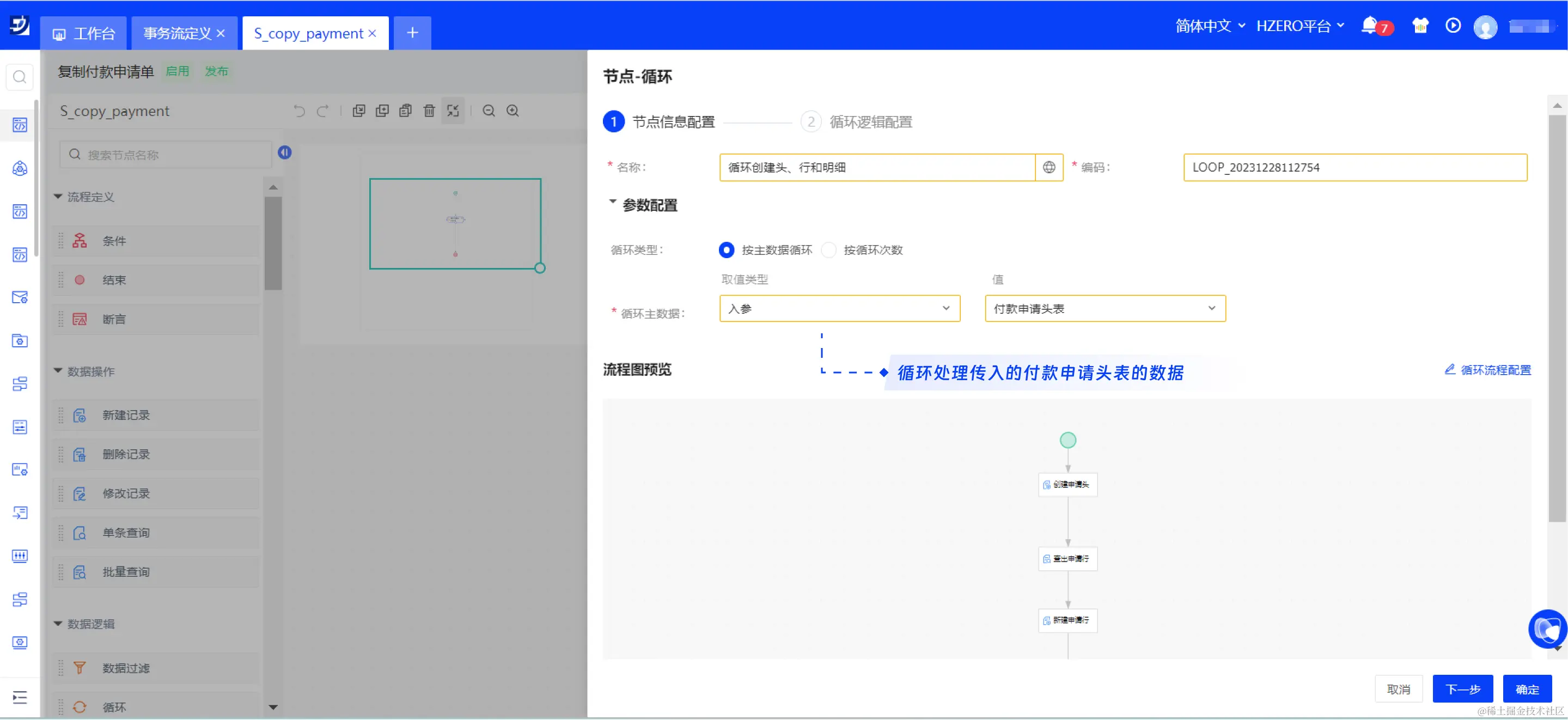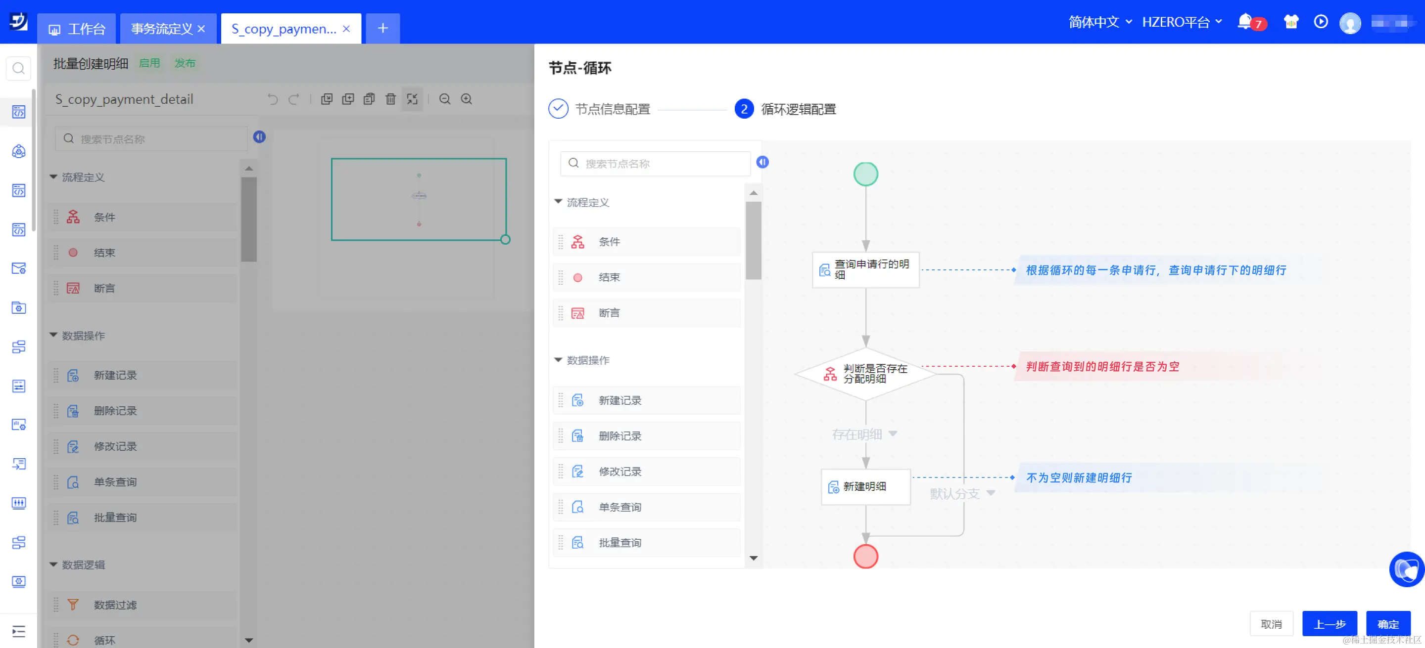 / / 在子事务流内,再次使用循环节点创建明细行。