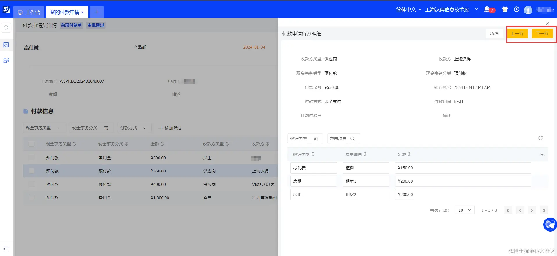 当完成以上配置后,用户就可以通过点击<上一行>和<下一行>按钮,轻松实现付款申请明细行之间的快速切换。