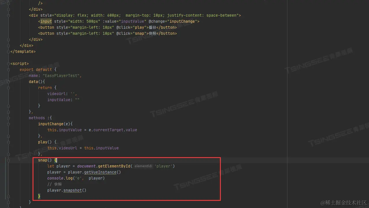 注意:如果需要使用到快照功能,需要先获取播放器easyplayer的vue实例,然后通过实例去调用snapshot方法。