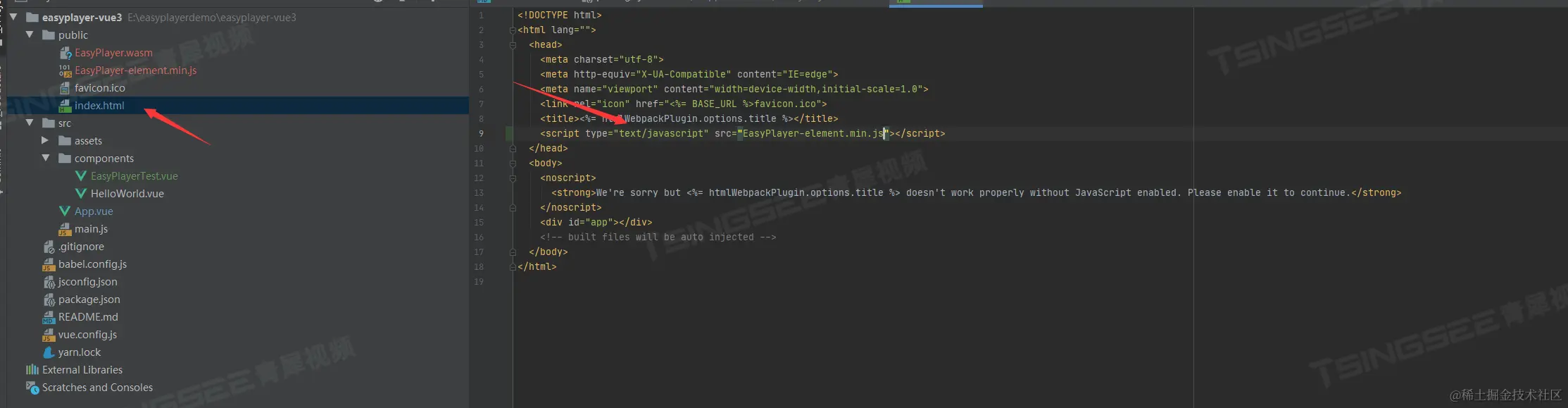 5)在项目的入口文件index.html中,通过script标签引入EasyPlayer-element.min.js,如下图: