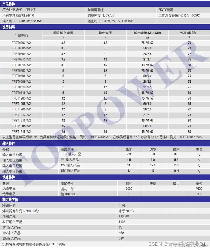 0.25W 3KVDC隔离单输出DC/DC SMD型电源模块——TPET-W2系列 青牛科技vxQNKJSY 2024-04-15 101 阅读1分钟 TPET-W2系列是一款标准的表面贴装电源模块,完全实现采用全自动贴片机来组装和满足回流焊工艺,大大提高产能和降低人工费用。此系列产品小,效率高,低输出纹波及提供3000V以上的直流电压隔离,SMD封装。