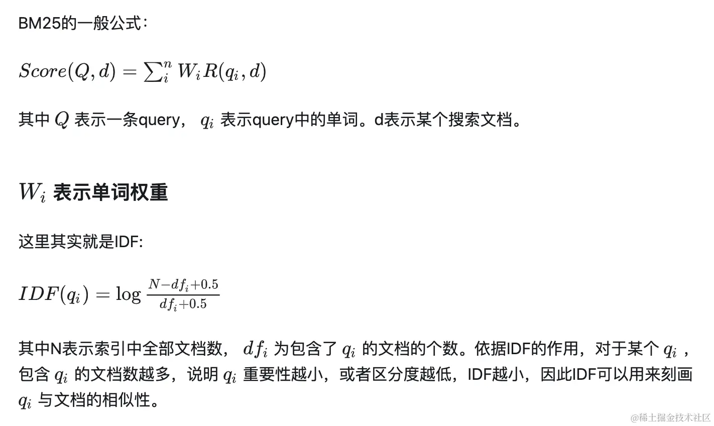 BM25算法公式如下图,详细介绍可参考文档 bm25算法介绍。