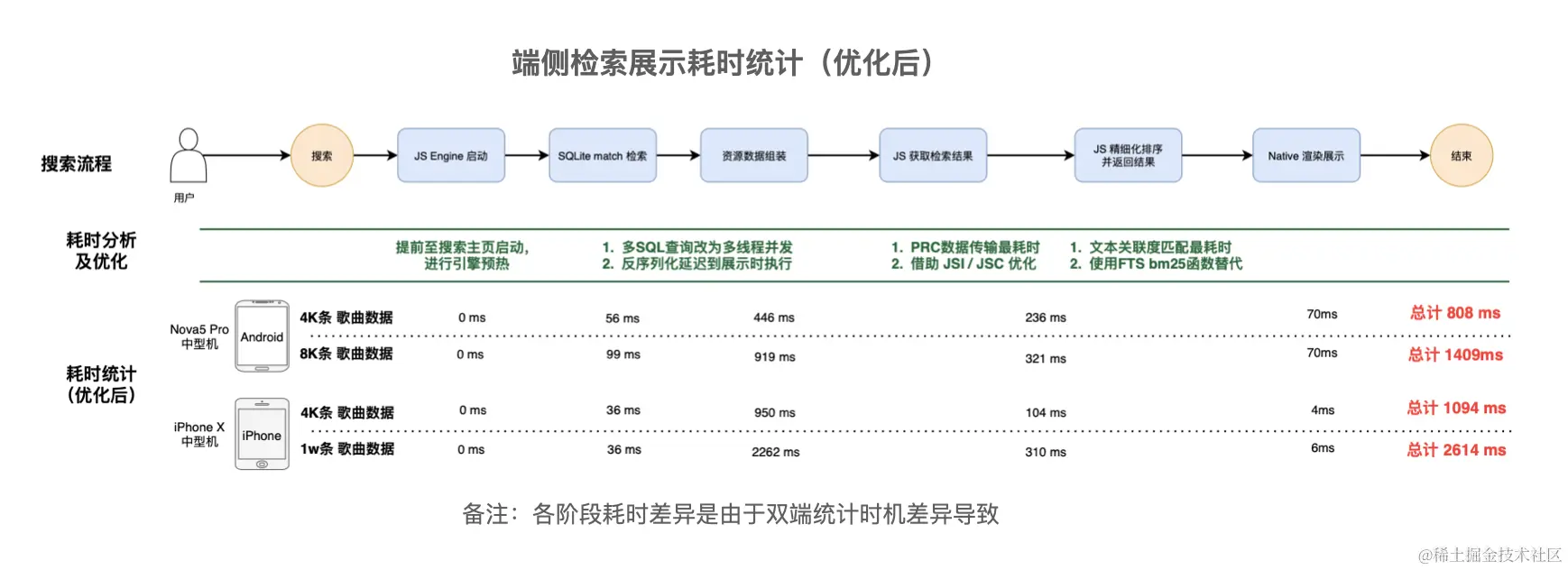 优化后,本地检索JS数据传输耗时大幅度降低,复测 1w 条数据耗时由 1400+ms 下降到 310ms 左右(基于iPhoneX测试)。