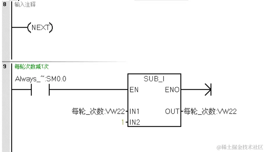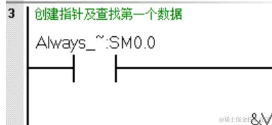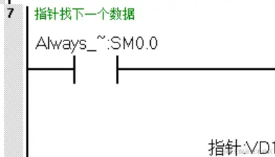 程序段5中的VD100在上一个循环已经指向了VB2开始的地址,在这个循环是加上2则VD104的数据指向VB4开始的地址。程序段6中VD104(VW4)的数据与VD100(VW2)的数据进行比较得到依次再循环。