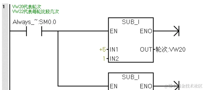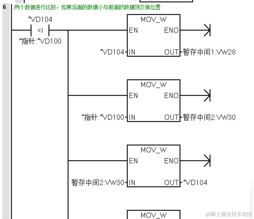 判断VD104(VW2)的数据与VD100(VW0)的数据,当VW2的数据小与VW0的数据则交换位置。