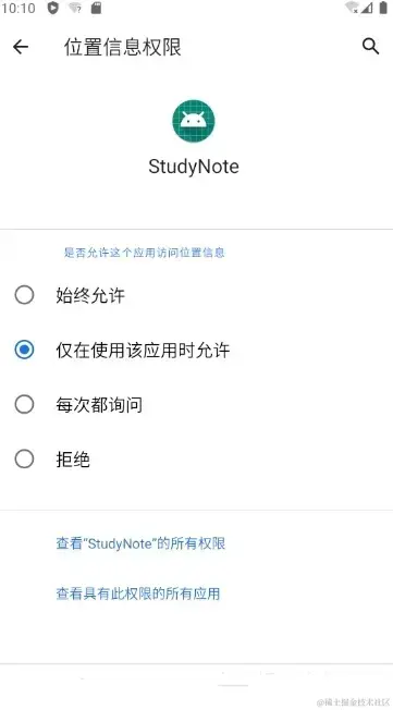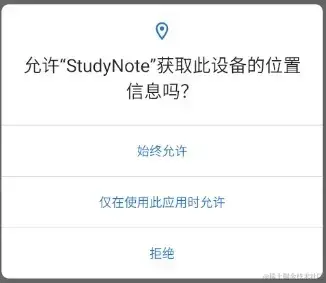 简单的说,就是在申请与位置信息、麦克风或摄像头相关的权限时,系统会自动提供一个单次授权的选项,只供这一次权限获取。然后用户下次打开app的时候,系统会再次提示用户授予权限。这个影响应该不大,只要我们每次使用的时候都去判断权限,没有就去申请即可。放一张新版本权限获取样式:
