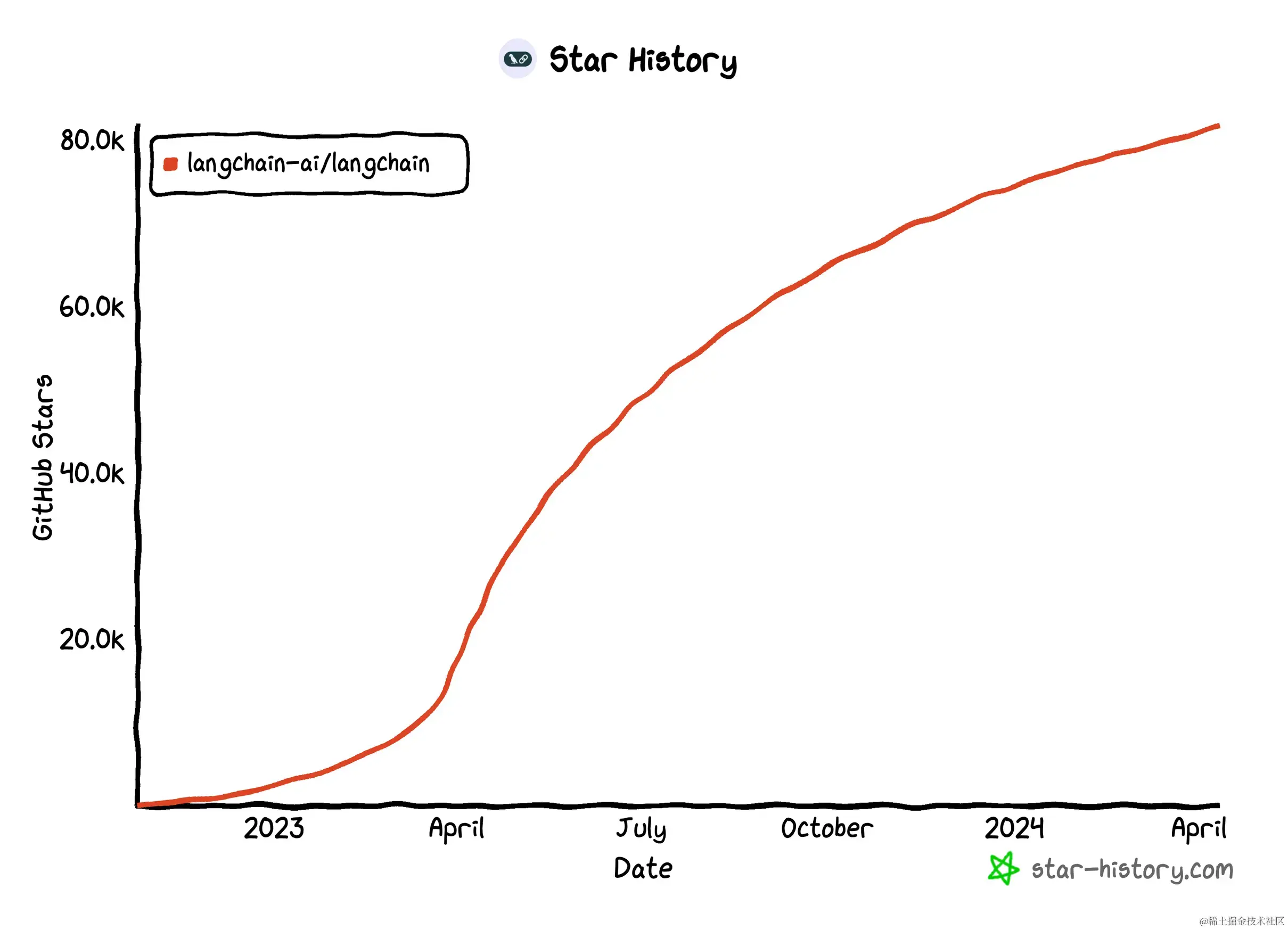 在各种 LLM 大模型迸发的同时,LangChain 框架也应运而生,作者在 2022 年底进行首次开源,短短几个月就成为最热门的开源项目之一,热度一直延续至今。
