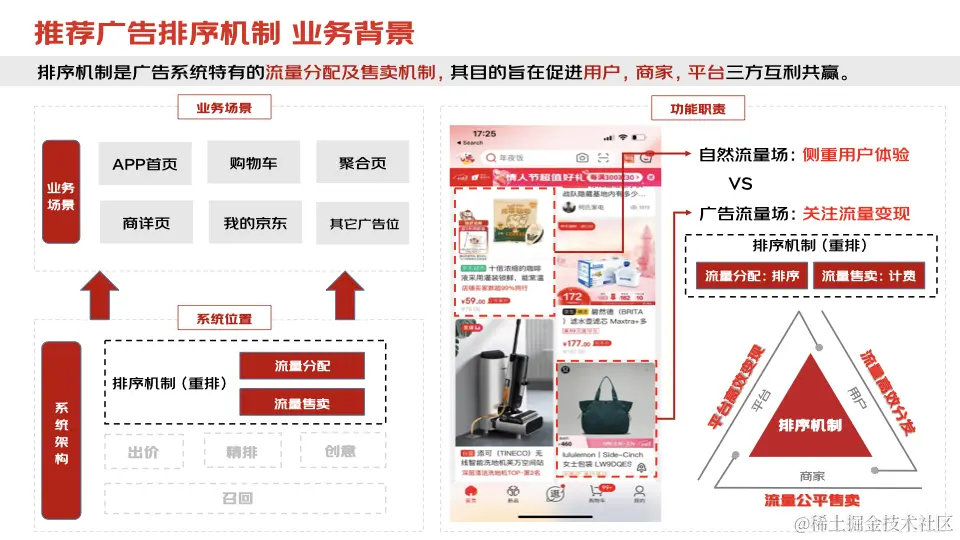 不同于自然搜推系统侧重用户体验的场域定位,广告流量场考量的是在 ****用户体验约束下的流量变现问题。在这个背景下,传统重排模块(Rerank)在电商在线广告中的业务定位发生了相应的变化,需在原有多业务目标(点击、GMV、时长等)基础上进一步兼顾平台广告收入,同时对胜出的广告进行合理公平的计费。由于其特殊的业务属性,广告系统中的重排有时也被称为 ****广告排序机制,其目的旨在促进用户、商家以及平台三方互利共赢。