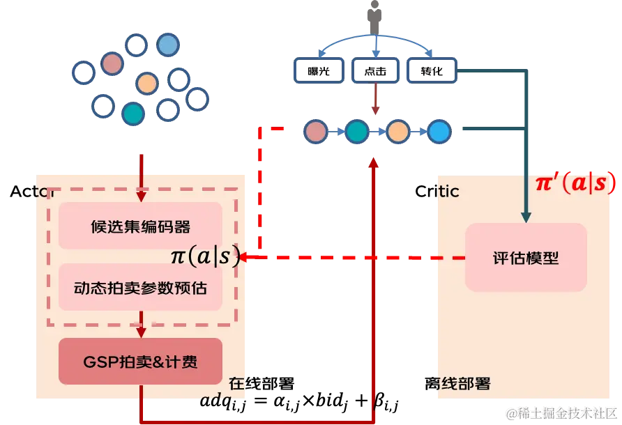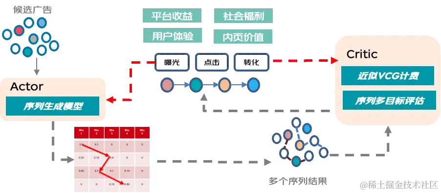 不同于传统基于 ecpm 的排序方式,模型化打分支持多业务目标的端到端学习。我们引入了基于强化学习 Actor-Critic 框架来建模流量长期价值,离线使用策略梯度回传方式对策略打分参数进行学习更新,在线我们通过 permutation invariant 的候选集编码器对候选物料进行建模,传入动态拍卖参数预估模型,进而实现分坑位的动态质量分计算。
