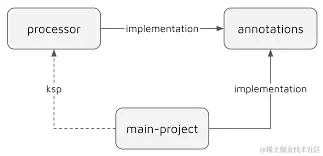 典型的KSP procesor(包括网上大部分的例子)都是分了三个module,一个是定义注解的module,一个是实现processor的,一个是使用注解和processor的。但这并不是必须的,为了方便,其实把注解的定义和processor放在一个module就可以了。只要把processor与使用它的module分开来了,就可以。