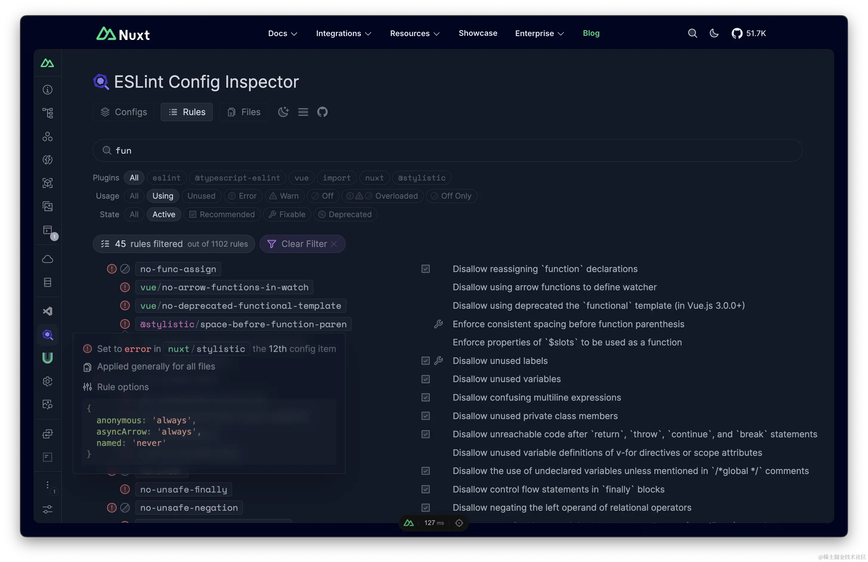 在迁移和研究新的扁平化配置时,我想到了一个主意,即为平面配置制作一个交互式 UI 检查器,并使配置更加透明且易于理解。我们已将其集成到 Nuxt DevTools 中,当你安装了 @nuxt/eslint 模块时,便可以轻松访问它。