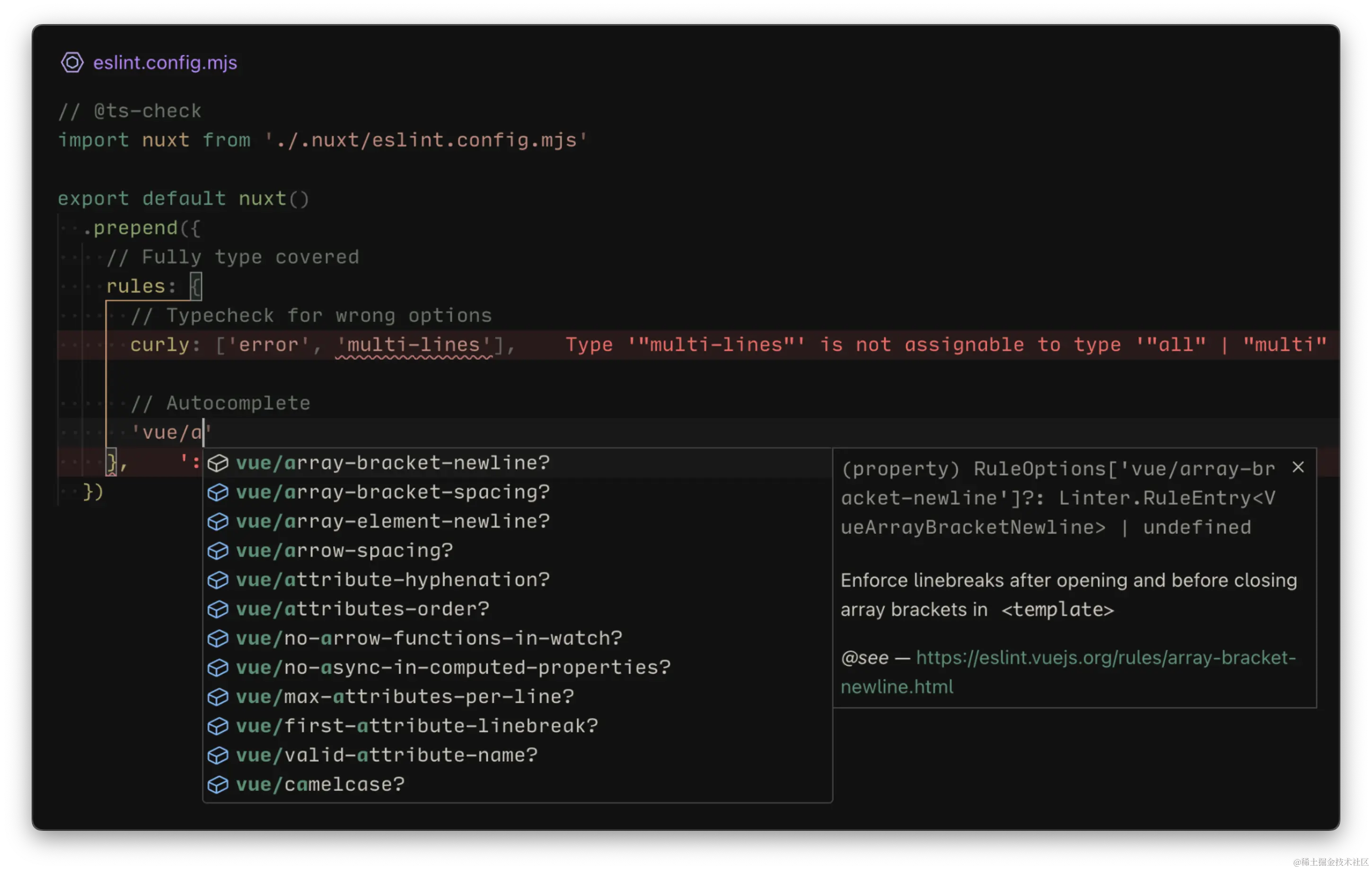 配置 ESLint 时主要的问题之一是缺乏针对规则和配置的类型信息。很难知道特定规则有哪些选项,并且需要查阅文档才能弄清楚这一点。