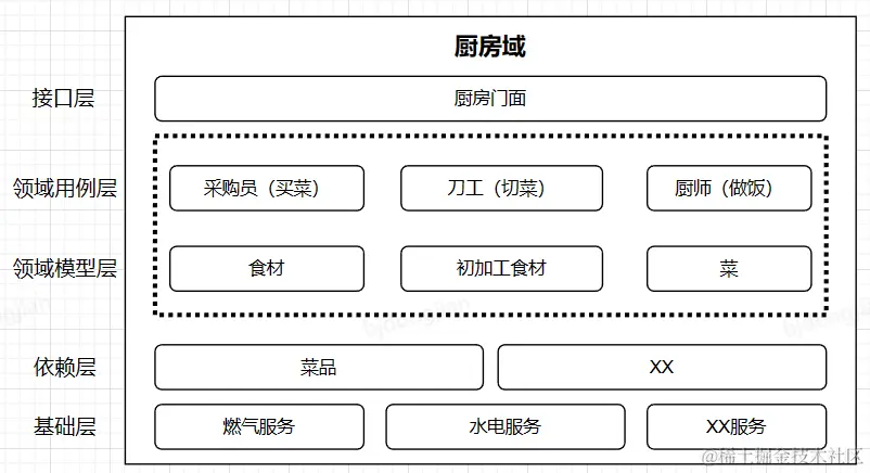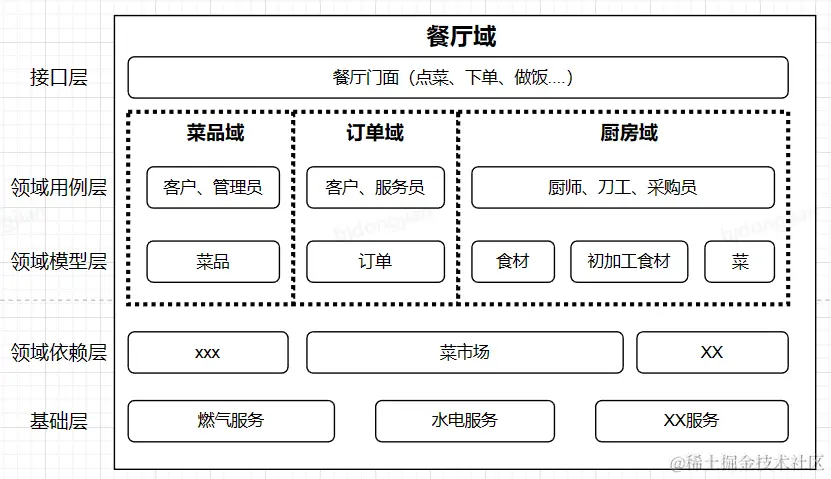 例如:厨房域(厨师服务、刀工服务、采购员服务),菜品域(客户服务、管理者服务)。