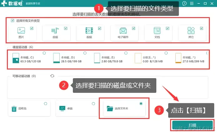 步骤2:根据实际的恢复需求,将所有要恢复的文件类型都勾选上(建议全选),并将文件删除之前所在的磁盘或文件夹勾选上,单击【扫描】;