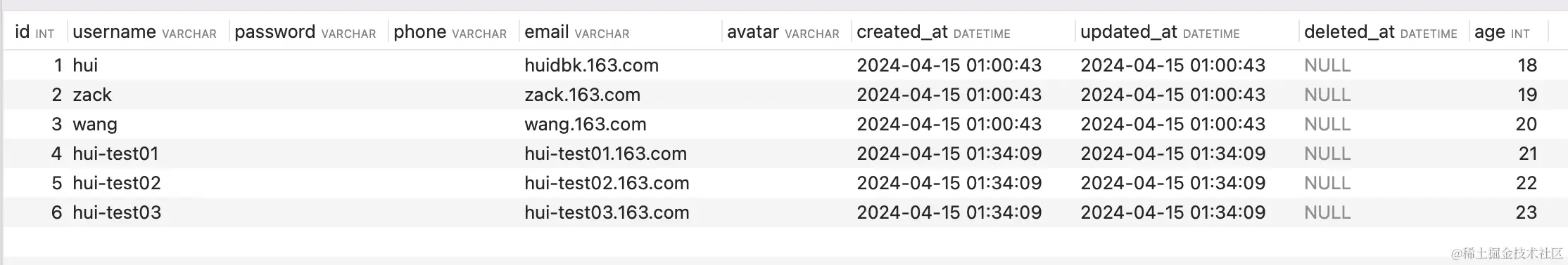 不指定列名,查询全部字段, 返回表实例对象 {'username': 'hui', 'age': 18, 'password': '', 'phone': '', 'email': 'huidbk.163.com', 'avatar': '', 'id': 1, 'created_at': datetime.datetime(2024, 4, 15, 1, 0, 43), 'updated_at': datetime.datetime(2024, 4, 15, 1, 0, 43)}